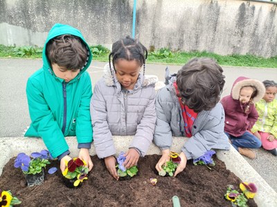 Les PS-MS ont annoncé le printemps en faisant du jardinage devant l’école. On a appris à casser les mottes de terre, mélanger la terre et le terreau avec une pelle et une griffe, creuser des trous, dépoter les plants pour les mettre en pleine terre. On peut désormais admirer des pensées et des giroflées dans les jardinières, pour le plaisir de tous !