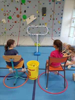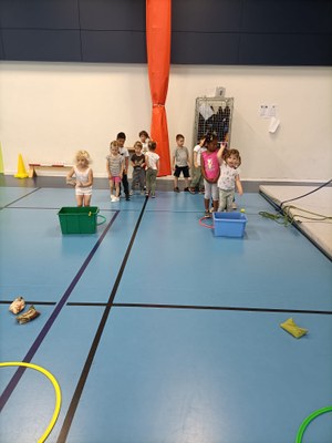 Nous avons constitué 6 équipes avec des PS/MS/GS et chaque équipe a participé aux ateliers proposés : relais, parcours, lancers, jeux…il y avait même un atelier dans lequel les lancers se faisaient assis comme si nous étions en fauteuil roulant.