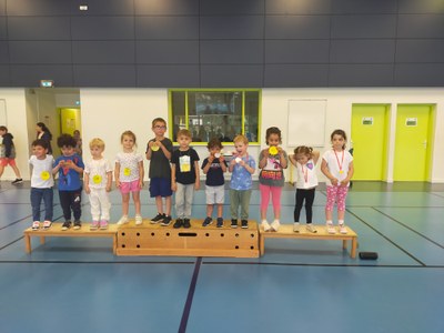 Puis nos parrains/marraines (de CM2) nous ont remis les médailles sur l’hymne national : c’était un très beau moment partagé dans un esprit sportif.